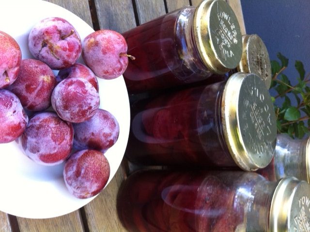 The huge saucepan that was part of the kit looked at least fifty years old but it seemed to have all the necessary parts, including a rack that the jars sit on while they cook. Once filled with plums and syrup and sealed, I dropped each jar in the pot of boiling water and let it simmer for two and a half hours. At first the pot overflowed as the water came out the thermometer gauge, and some of the taller jars weren’t immersed in water as I thought they should be, but Steve helped me ladle out a bit of the excess water and had the good idea of lying the bigger jars on their sides so they would be covered.