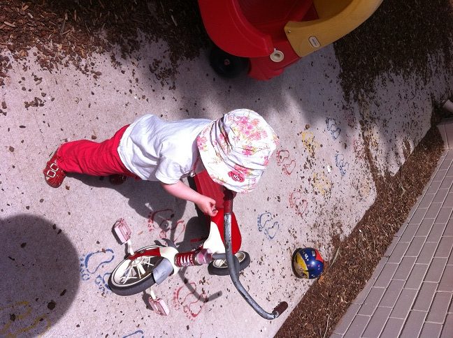 We arrived at playgroup as usual and the girls wandered off (yes, they’re walking now, and I’ve accepted that they are toddlers) to explore the toy scooters, cars, baby prams and the sandpit outside. They weren’t paying too much attention to the parents and carers or to the eight or so babies and children aged from four months to nearly three. We all sat under the big old pine tree outside on toddler chairs by the toddler table eating fruit for morning tea. Rhea sat at a little chair and Lara was on my knee. There was a new baby aged nine months and his mother and a new boy aged 22 months and his father and I had a chat to both parents, wanting to make them feel welcome.