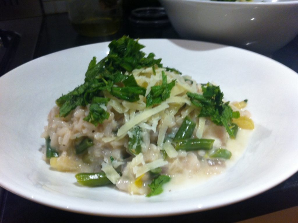 Wednesday night, another Jamie Oliver creation, this one a risotto with purple onion, zucchini (I used up the rest of a huge one Maggie had given us many weeks before from her garden), mint (the rest of the bunch now) and a large ball of five-day-old buffalo mozzarella with grated parmesan. No dessert that night.