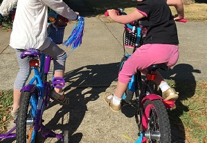 We had three after-school sessions without training wheels, where we ran along steadying the girls down the street to balance them, letting go for a few seconds every now and then. There were only one or two falls, and little by little they could ride longer stretches without our help. Last weekend we met the girls’ godparents at their local oval encircled by a kilometre-long cycle track in deep shade under huge evergreens. This was where they learnt how to ride comfortably by themselves, and even to push themselves off. We sat on the park bench and enjoyed Di’s home-made muffins and a cup of tea and didn’t have to run around with them at all.