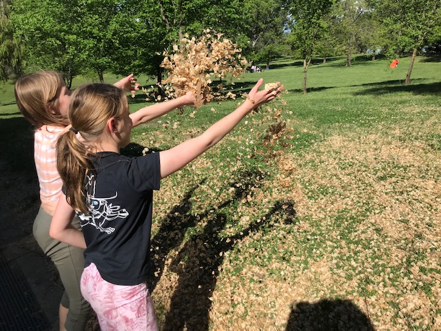 After that, we walked to a jetty along the lake and the girls amused themselves competing to flip their 250ml juice bottles to a standing position the most times in a minute. We continued up to the playground and were persuaded to play some rounds of tips, and on the walk back through the fields, Rhea and Lara threw handfuls of plane tree seeds to the wind which I tried to do justice to in a through photo; Lara climbed a huge tree whose branch reached along the ground; and we investigated a crevice in another tree with a stick.